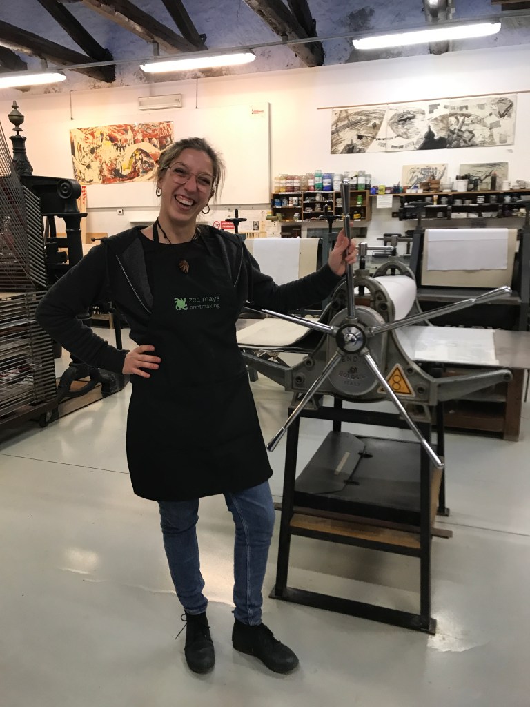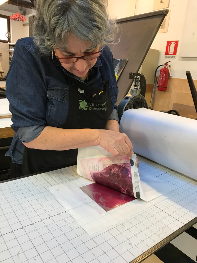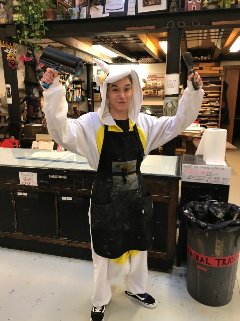 It’s really incredible how easily one can slip into a new way of life. We’re feeling comfortable at the Scuola, printing on the Bendini press, with the wonderful women who staff the studio, Roberta, Alessia, Marta, and the Unicorn!