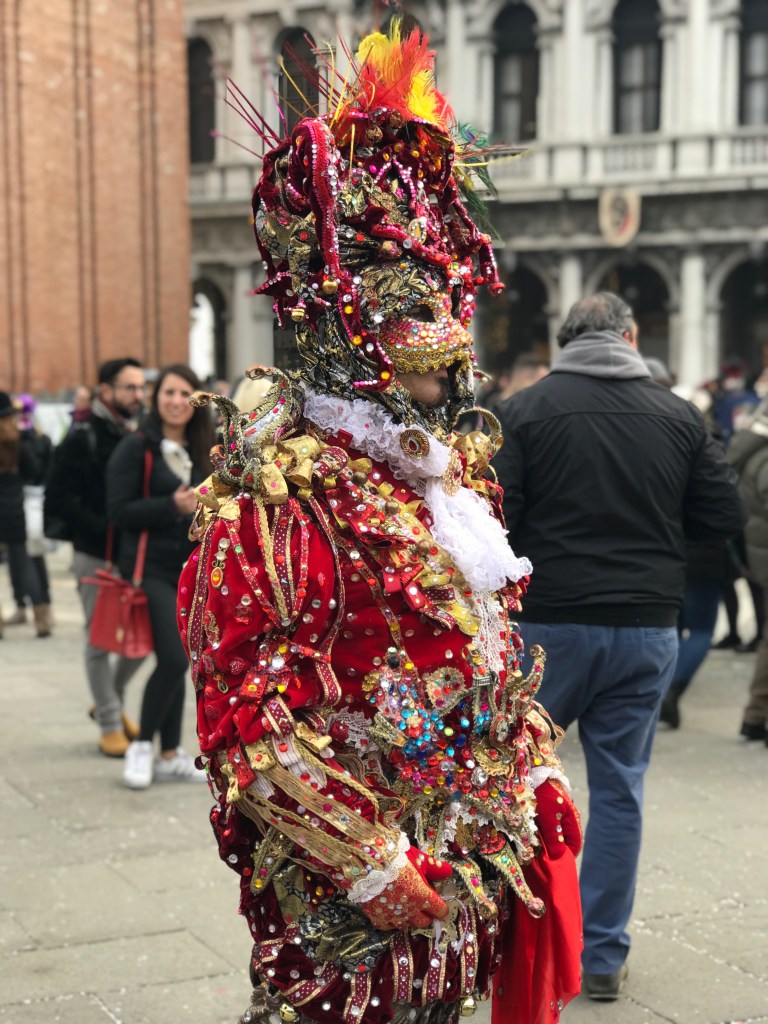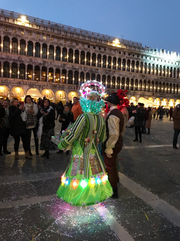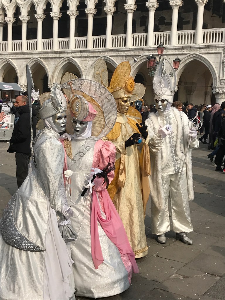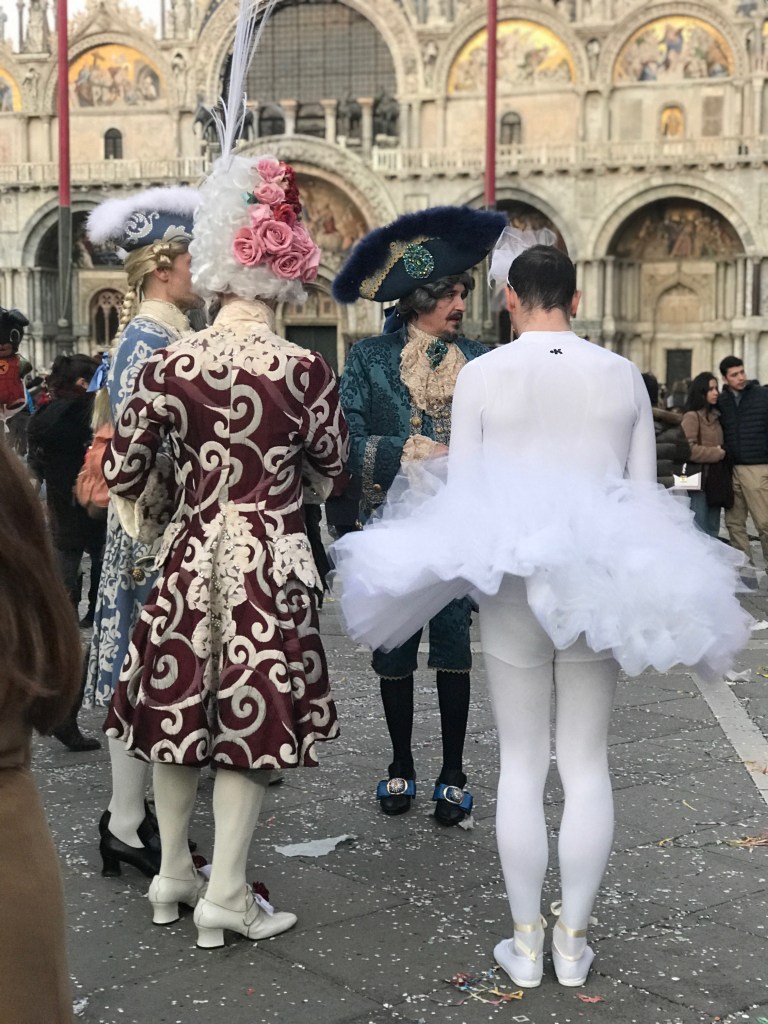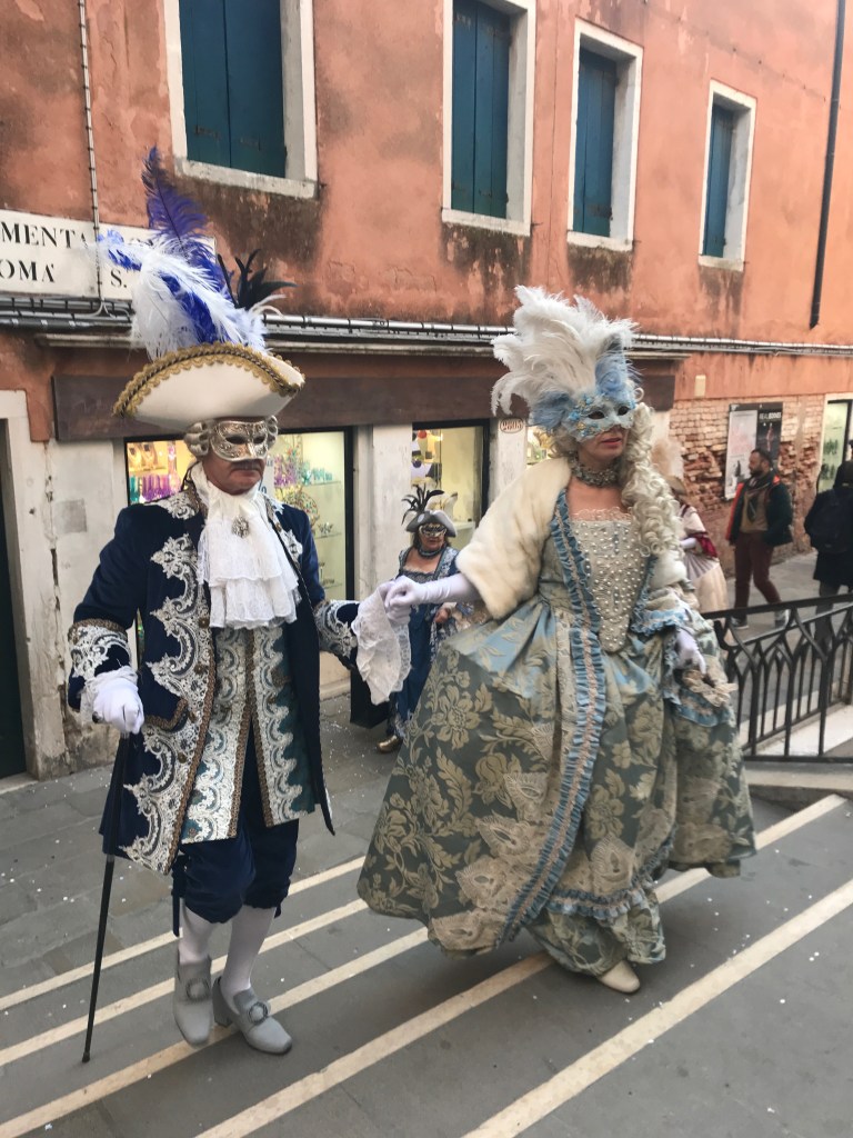 This was the last weekend of Carnivale, and we were out in the crowds soaking up the majesty of it all before we heard about the corona virus hitting this area. It’s incredible to be in a place where so many adults dress up and prance about the town. Everywhere we went we saw people in full-on regalia; from historic costumes including wigs, shoes, masks and handbags, to contemporary costumes of Disney and video game characters. The most dedicated assume the character and strike poses for all the cameras that surround them. People flock to the squares to see and be seen. One of my favorite moments was when a woman in complete Marie Antoinette personna reached into her silk handbag to answer her cell-phone. Time folding in on itself!
